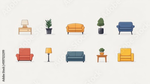 Vector pictogram featuring various simple furniture items like sofas, lamps, and plants, ideal for interior design projects and digital graphics