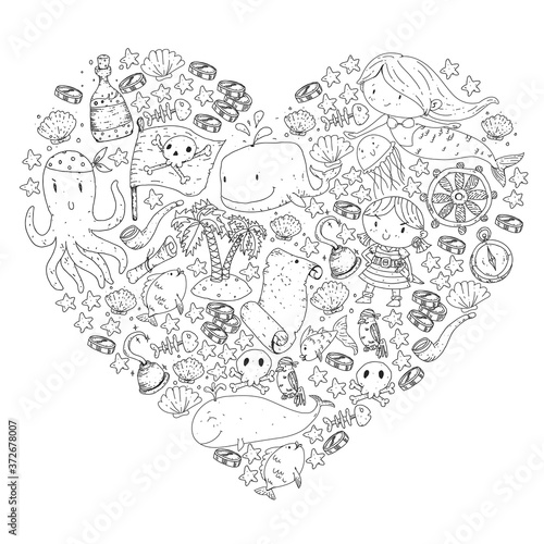 Vector pirate set in cartoon style. Sweet card with pirates, ship, whale, crab, octopus, mermaid, rum, anchor, treasure, fish, island and parrot.