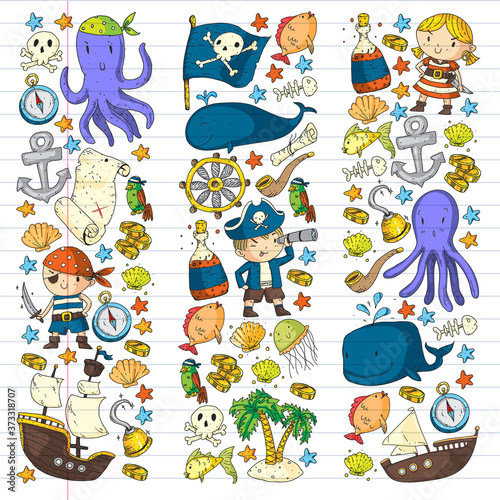 Vector pirate set in cartoon style. Sweet card with pirates, ship, whale, crab, octopus, mermaid, rum, anchor, treasure, fish, island and parrot.