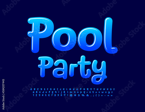 Vector playful Emblem Pool Party. Funny Glossy Font. Modern Alphabet Letters and Numbers