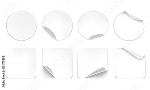Vector realistic round and square sticker with curled edges and shadow isolated on transparent background. Mockup of adhesive sticker for design. Label, price tag template.