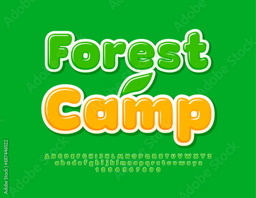 Vector recreational sign Forest Camp with decorative Leaf. Green glossy Font. Modern style Alphabet Letters and Numbers set