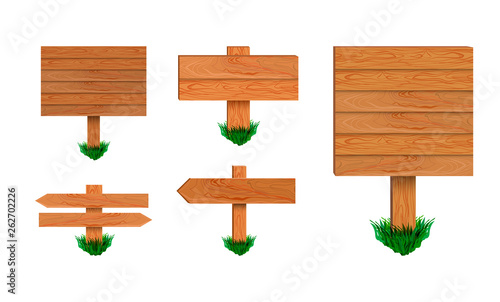 Vector Retro Signboards Collection on White Background, Wood Arrow Sign Collection with Green Grass.