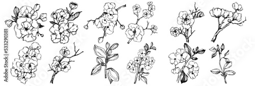Vector Sakura summer. Isolated botanical flower, leaves. Black and white engraved sketch ink art. Leaf plant botanical garden floral foliage. Wildflower drawing leaf illustration element.
