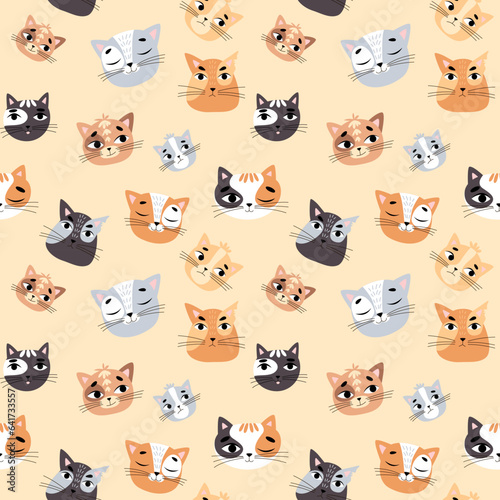 Vector seamless children's pattern with cat faces on a pink background. Suitable for baby prints, baby room decor, wallpapers, wrapping paper, stationery, scrapbooking, etc.