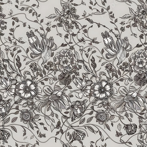 Vector Seamless Monochrome Floral Pattern. Hand Drawn Floral Texture, Decorative Flowers, Coloring Book