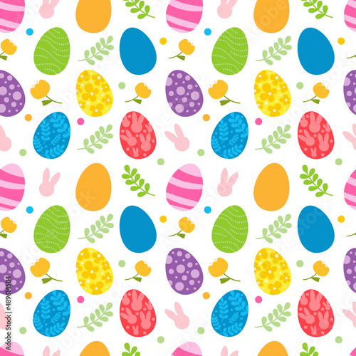 Vector seamless pattern. Background with many Rabbits, eggs, flowers, leaves scattered. Festive Easter Day surface pattern design. Spring season. For printing on fabric and paper, cards, social media