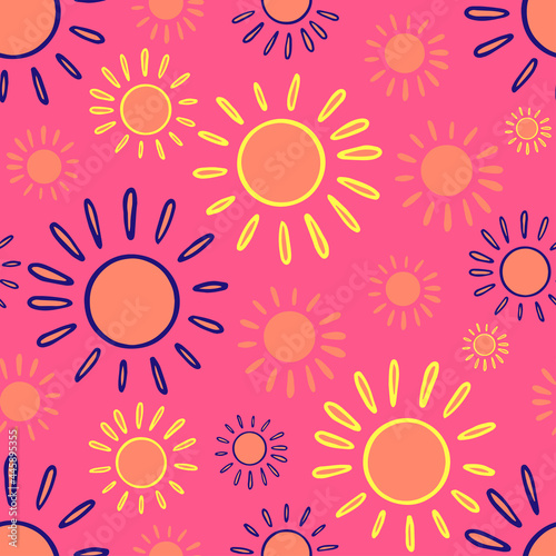 Vector seamless pattern colorful lined design of abstract lined sun in pastel colors on red