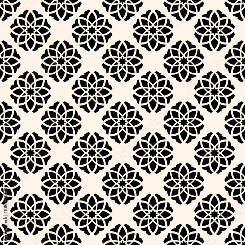 Vector seamless pattern in oriental style. Abstract black and white geometric ornament texture in traditional islamic, arabic, moroccan style. Luxury floral geo background. Repeated monochrome design