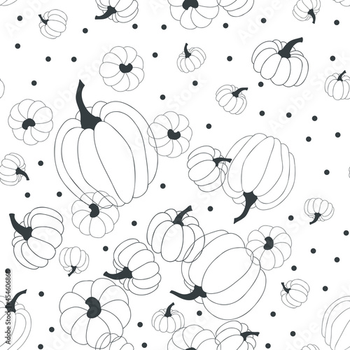 Vector seamless pattern of black doodle hand-drawn autumn pumpkins and dots on white background. Endless ornament for textile, gift wrap, wallpaper, wrapping, scrapbooking, and more. Vector