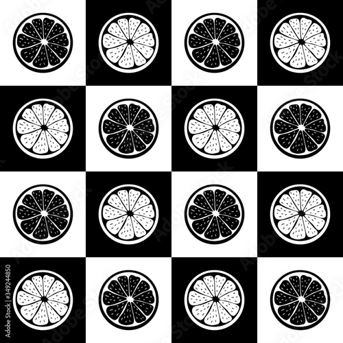 Vector seamless pattern of citrus fruit. Lemon, orange, grapefruit, lime. Black and white elements in the squares. Monochrome background for creative designs, banners, textiles, menus, prints, packing