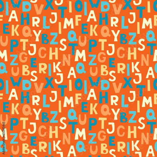 Vector seamless pattern of colorful funny letters on an orange background. Suitable for baby prints, kids room decor, wallpaper, wrapping paper, stationery, scrapbooking, etc.