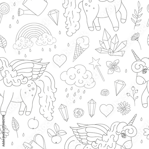 Vector seamless pattern of cute unicorns, rainbow, clouds, crystals, hearts, flowers outlines. Sweet girlish illustration. Line drawing of fairytale magic garden