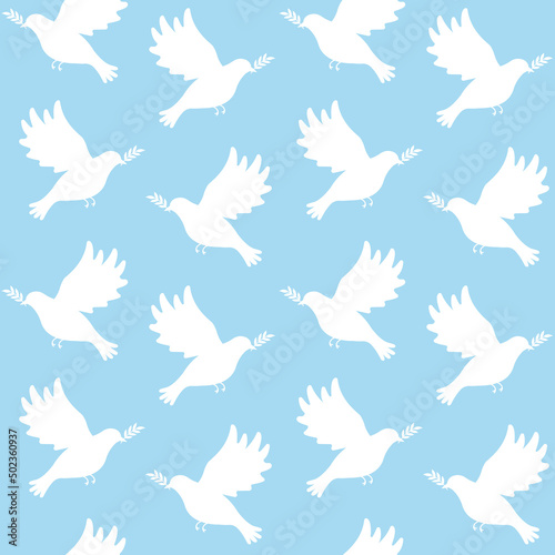 Vector seamless pattern of flat pigeon of peace silhouette isolated on blue background