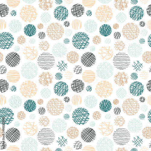 Vector seamless pattern of round geometric shapes. Simple texture of hand drawn curves, lines, spirals. Contemporary trend illustration. Doodle abstract background, wallpaper. Original concept design