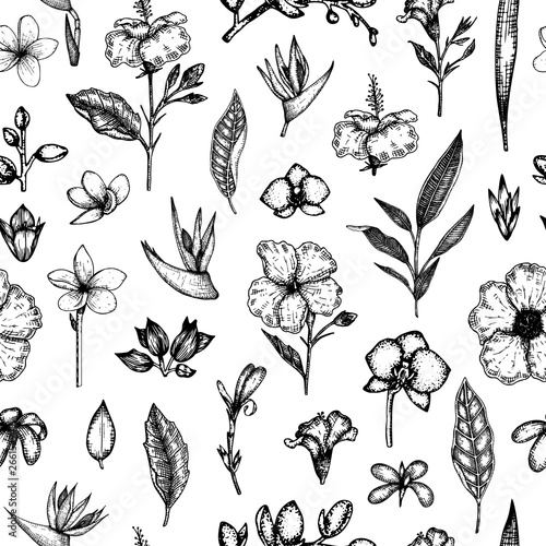 Vector seamless pattern of tropical flowers isolated on white background. Hand drawn floral background. Floral graphic black and white repeating ornament. Tropic design elements. Line shading style