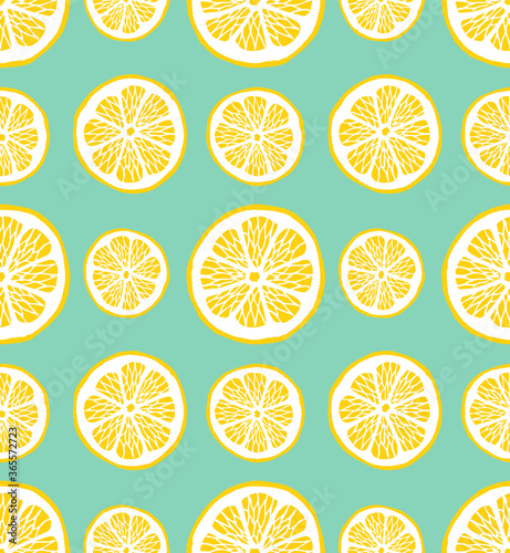 Vector seamless pattern of yellow hand drawn doodle sketch lemon slices isolated on mint turquoise background