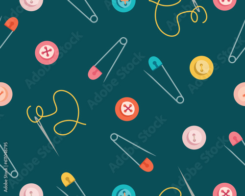 Vector seamless pattern using sewing tools. Illustration of safety pins, needles and buttons. Vector illustration in a flat style