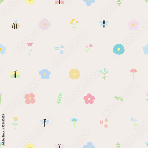 Vector seamless pattern with bees, flowers, dragonflies, butterflies. For birthday or party invitation, baby shower, fabric, textile and linen, print clothes and pajamas, gift and wrapping paper.