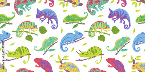 Vector seamless pattern with chameleons sitting on a tree branch on a white background
