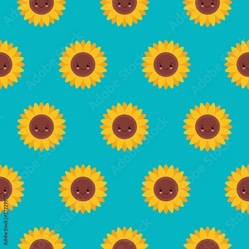 Vector seamless pattern with cute sunflowers on blue. Sweet honey background for beekeeping products.