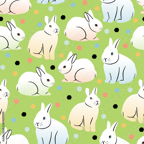 Vector seamless pattern with easter bunnies on light green background in geometric style