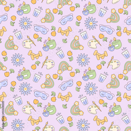 Vector seamless pattern with elements for a healthy lifestyle. mental health. Self love, self care, self support, mental health.