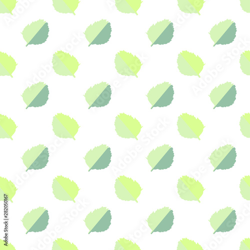 Vector seamless pattern with green and yellow autumn leaves on a white background.