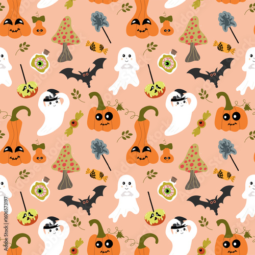 Vector Seamless pattern with kawaii ghost, bat, pumpkins, poison candy apple, mushrooms on pastel pink background for Halloween. For prints, packaging, backdrops, stickers, posters,spooky decorations.