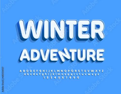 Vector seasonal flyer Winter Adventure with Alphabet Letters and Numbers set. 3D creative Font