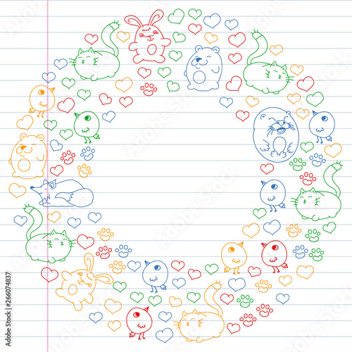 Vector set of beautiful round icons icons in doodle style. Painted, colorful, pictures on a piece of linear paper on white background.