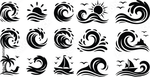 Vector Set of Black and White Sea Waves Sun and Sailboat Icons