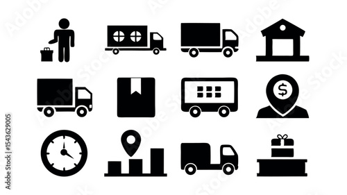 Vector set of black transport icons including buses, trucks, and location markers for logistics, delivery, travel, or navigation themes in silhouette style.