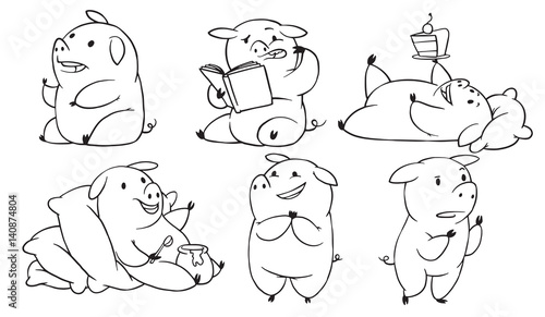 Vector set of cartoon images of funny plump pigs in different poses with different emotions on a white background. Made in monochrome style. Positive character, farm. Line art. Vector illustration.
