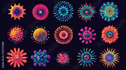 Vector set of coronavirus shapes in bold pop art colors, featuring simple geometric patterns and contrasting neon shades