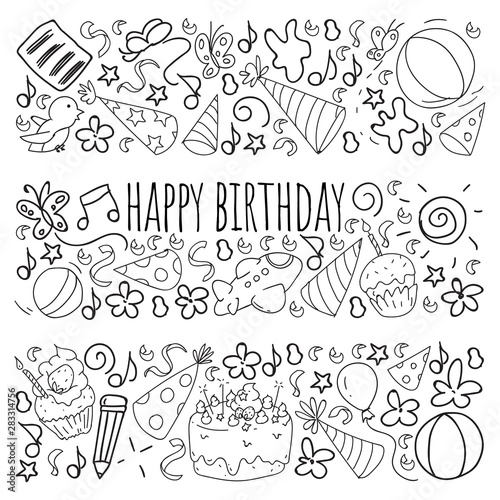Vector set of cute creative illustration templates with birthday theme design. Hand Drawn for holiday, party invitations.