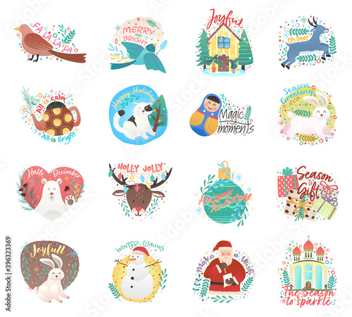 vector set of cute ornaments christmas time cartoon illustration greeting cards template. backgrounds big collection set with deer, rabbit, deer, and snowflakes and xmas elements.