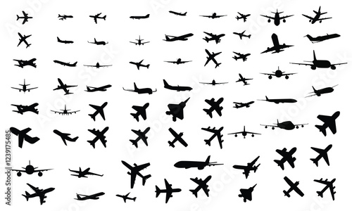 Vector Set of Different Kind of Airplanes Silhouettes in flight takeoff running