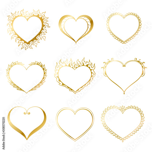 Vector set of golden hearts. Creative hand drawn hearts for card design