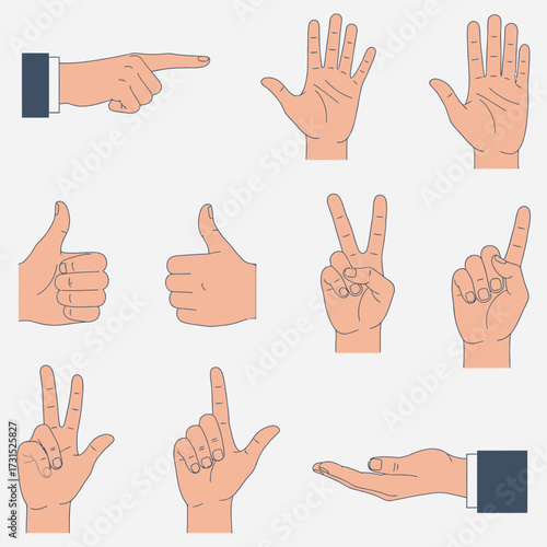 Vector set of human hand gestures, illustrating various signs like pointing, thumbs up, victory, and counting, ideal for communication and graphic design projects