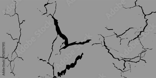Vector set of realistic cracks, on a concrete gray wall. Scratches with holes of different shapes. Damage effect. Broken ground, earthquake, erosion or drought. Top view.