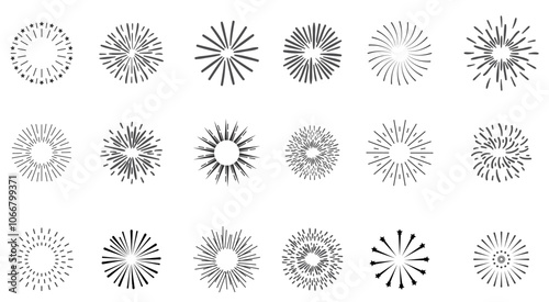 Vector set of retro style geometric shine icons, black circles isolated on white background, rays of explosions.