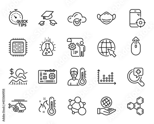 Vector set of Settings blueprint, Medical analyzes and Chemistry lab line icons set. Motherboard, Throw hats and Internet icons. Seo phone, Integrity and Thermometer signs. Vector