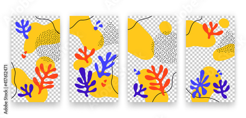 Vector set of social media stories templates with trendy contemporary aesthetic hand drawn abstract leaves and fluid shape forms. Backgrounds with creative Matisse inspired floral illustrations