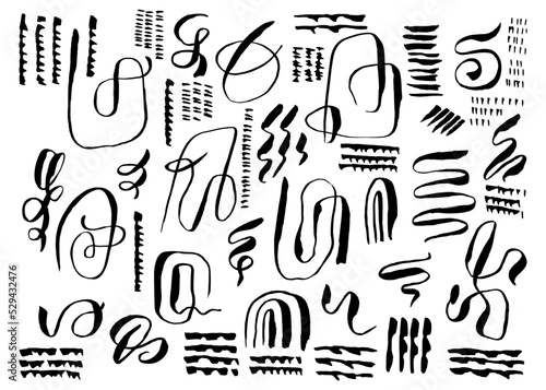Vector set of stylish artistic hand drawn textures. Lines, circles, smears, waves, brush strokes, knots. Hand drawn wavy shaped elements for your graphic design