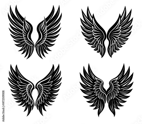Vector Set of Stylish Black Wings – Dark Angel and Demon Wing Designs for Tattoo Sketches, Posters, and Fantasy-Inspired Graphic Work.