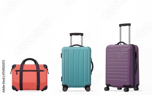 Vector set of suitcases. Luggage on wheels for traveling. Modern suitcases with handle. Backpack for traveler. Vacation bags. Flat vector illustration isolated on white background. High quality