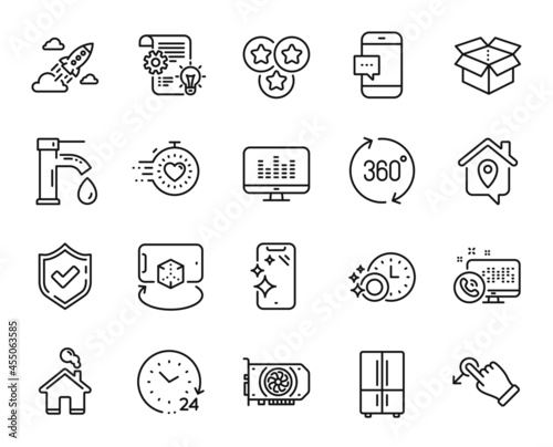 Vector set of Timer, Startup rocket and Confirmed line icons set. Cogwheel, Augmented reality and Open box icons. Tap water, Music making and Smartphone message signs. Timer web symbol. Vector