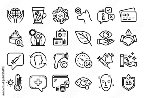 Vector set of Veterinary clinic, Vaccine announcement and Mint leaves line icons set. Calendar report, Money wallet and Credit card tag. Vector