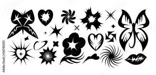 Vector set of Y2k icons or stickers. Brutalist design tattoo compositions or prints. Psychedelic style.